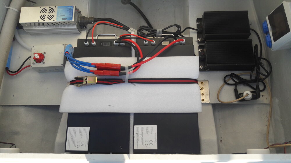 Takže sobotní zkouška na baťáku 4 dospělí a 3 děti dopadla na výbornou, akorát pár postřehů bych sepsal: Rychlost se snížila z 9,7km/h na 9,1 což při zatížení cca 450kg vůbec není zlé. Baterie nabity na 95 a 93%, cesta tam v průměru 7km/h - 1,7kW cesta zpět 9km/h - 3,1kW a z baterií ubylo na každé 10% tak přemýšlím jestli je vůbec kdy budu nabíjet :-D Plavba když odpočítám přestávky cca 3h? Loď je opravdu stavěná na těžký motor a i když jsme na lavici seděli ve 3 dospělých, čumák byl ponořený víc než záď, v úvahu přichází posunout baterie víc na "prdel" což se mě moc nechce jelikož přesně sedly do místa určeného pro benzínovou nádrž viz. foto, nebo mám v lodi díru a nebo na zadek vrazit kovadlinu :-) Po překopání hokejky řízení se o 100% zlepšila stabilita a není potřeba až tak moc srovnávat neustále loď do roviny, to že se zmenšil úhel otáčení motoru L/P na otáčení lodi na místě nemělo žádný vliv a to vyrovnávání které jsem musel teď dělat bylo podle mě právě tím zapichlým "čumákem" do vody. Z podpalubí vyteklo po vytažení lodi z vody a vyšroubování zátky ze zádi cca 0,5-1l vody, objednal jsem litr Raptoru a naválečkuju celý spodek po čáru ponoru, i když nechápu kudy tam nateklo, procházel jsem celý trup zespod a nikde díra není.... ještě mě napadlo jelikož zakrývací plachta je neprodyšná a po ránu než jsem vyjel na baťák byla vysrážená kaluž i na palubě, takže vlastně mám lodní pařeník :-D, tak jestli se nesráží voda i v podpalubí? Když by nátěr nezabral prdnu dozadu bilge pumpu. Každopádně se těším až ji vyzkouším na vranclu bo na baťáku nic moc :-)