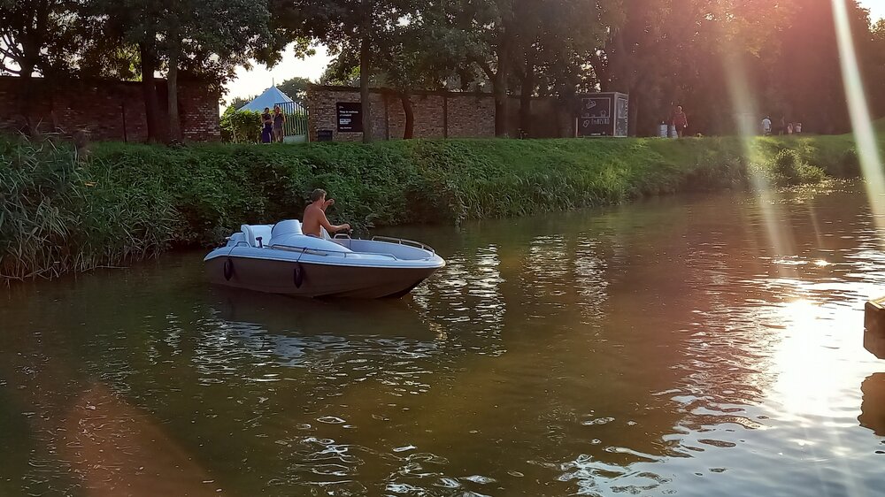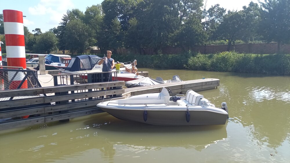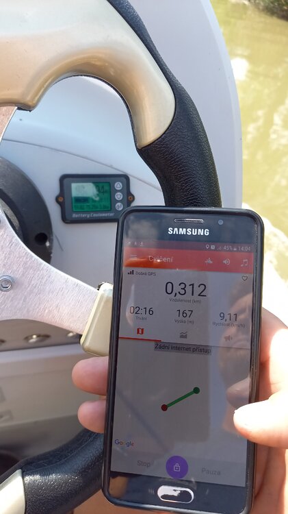 Hezký příspěvek. Ty parametry jízdy jsou až neuvěřitelné. Jsi si jistý těmi 9,6km/h na 2,6kW? Při téhle rychlosti bych u téhle lodě čekal, že už hodně hrne vodu. I když možná tím, že je elektro má těžiště mnohem více vpředu nežli když vzadu visí 130kg spalovací motor. Děkuji, snažil jsem se být stručný jinak by to bylo tak na 6ti stránkový elaborát.... No abych pravdu řekl, měřil kolega co to točil přes mobil a lítalo to mezi 9,2 - 10,5km/h skepticky se přikláním k nižšímu číslu a pokud jsem dal maximum což při stavu baterie poslalo do motoru 3900W podle bočníku tak už se nic moc nedělo, proto bych chtěl ještě zaexperimentovat s vrtulí jestli to bude mít nějaký efekt, motor váží 25kg to jediné zatěžuje zrcadlo, baterie cca 2x27kg jsou nacpané těsně za lavicí viz foto a člun na vodě bez posádky je téměř v rovině, se mnou a kolegou se pohybuju na celkové hmotnosti kolem 600kg. Pokud bude o víkendu vhodné počasí, mám v plánu test 4dospělí 3děti a jsem zvědav....