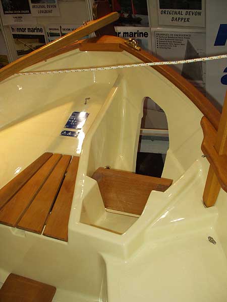 Na stánku firmy Honnor Marine Ltd. na Boat Show nás zaujala, mimo vystavených lodí, malá specialita této firmy. Firma Honnor Marine se specializuje na výrobu laminátových plachetnic s historizujícím vzhledem. Ty jsou u typů s větší délkou vybaveny přívěsným motorem. Aby motor umístěný mimo vnější obrys trupu nehyzdil noblesní vzhled lodi je umístěn umístěn uvnitř trupu mimo podélnou osu plavidla a jeho noha prochází otvorem v obšívce na zádi u kormidla.