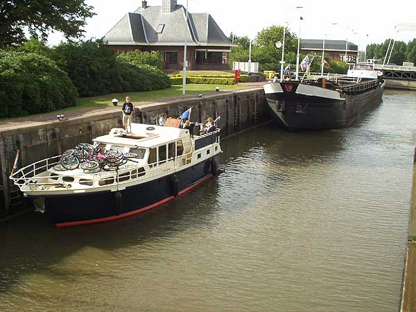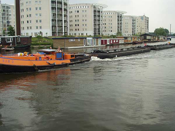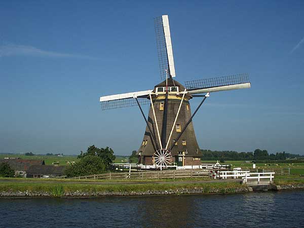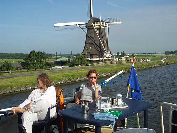 Domy v Amsterdamu se rychle zmenšují za naší zádí, přidáváme plyn a plujeme po Amstelu směrem ke Goudě. Amstel je relativně široký a neprochází mnoha vesnicemi, ve kterých bývá rychlost plavby omezena na necelých 10 km/hod. Můžeme si tedy dovolit nasadit ostřejší tempo, aby nám plavba rychleji ubíhala. Po několika kilometrech sundáváme dětem kola z paluby na břeh. Hrajeme s nimi na honěnou. Děti jedou po asfaltové silničce vedoucí těsně vedle kanálu, my se vezeme na lodi. Jsme ve výhodě, nemusíme šlapat. Za těch několik dnů dovolené jsme se dokonale oprostili od každodenního shonu, v podstatě nikam nespěcháme a užíváme si plynoucího dne na horní palubě. Nastavujeme tváře slunci, popíjíme, vykládáme a je nám dobře.