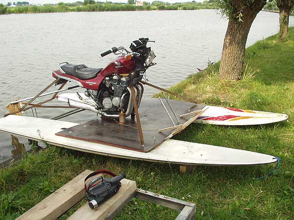 Zastavujeme pouze dvakrát. První zastávku děláme, abychom si mohli na břehu prohlédnout plavidlo, jaké jsme ještě neviděli. Jeho základem jsou dvě surfová prkna, každé jinak dlouhé, vrak motocyklu Honda, jeden lodní šroub, několik rezavých želez a zbytek surfového ráhna: Chvíli surfo-skútr fotografujeme a na konec se rozhodujeme navštívit majitele v jeho domě s prosbou o svezení. Zvoníme na domovní zvonek, ale nikdo nám nepřichází otevřít. Druhou zastávku děláme před větrným mlýnem, který zasazen doprostřed zelené louky, vytváří kompozici jako z pohlednice.