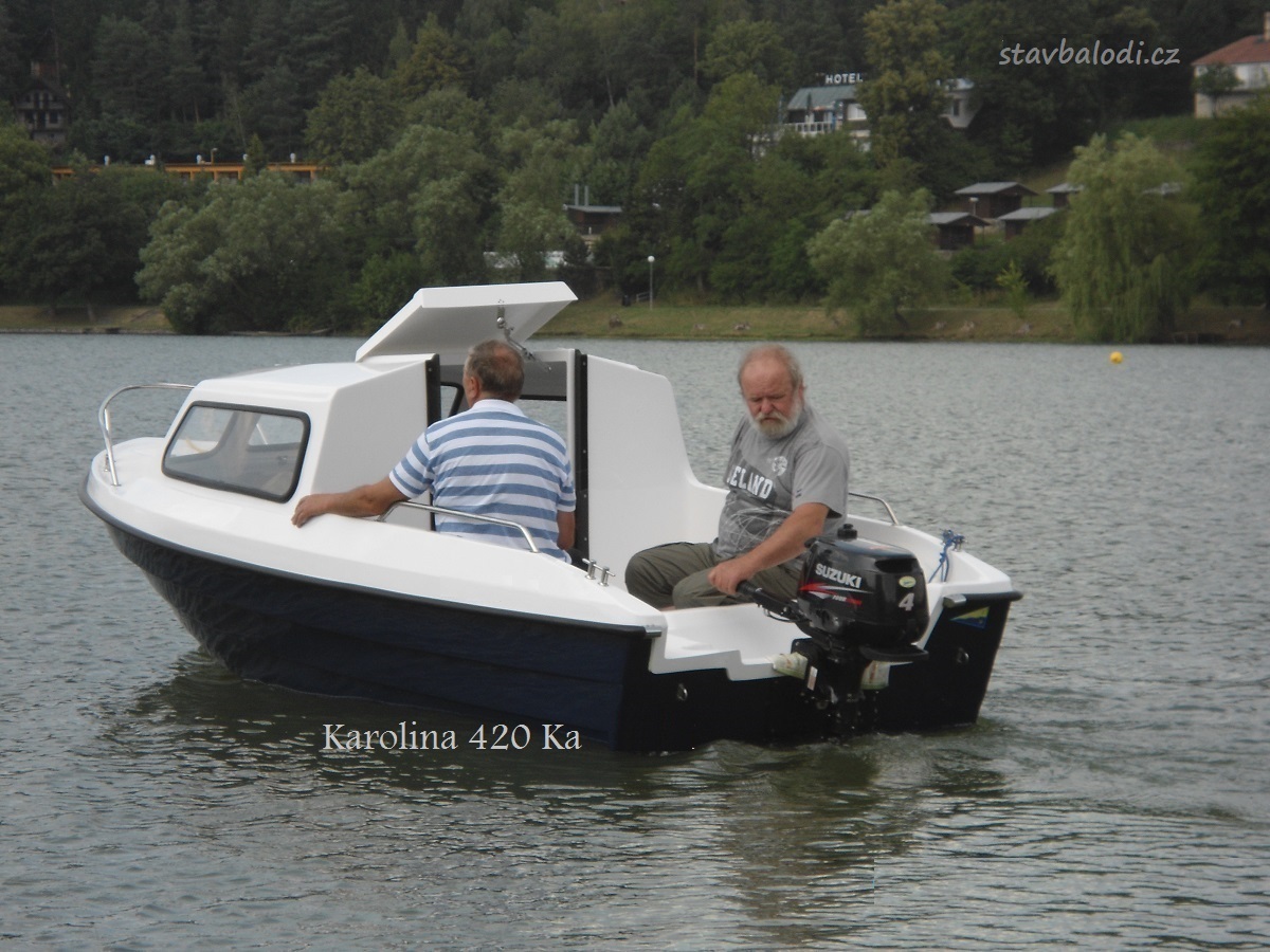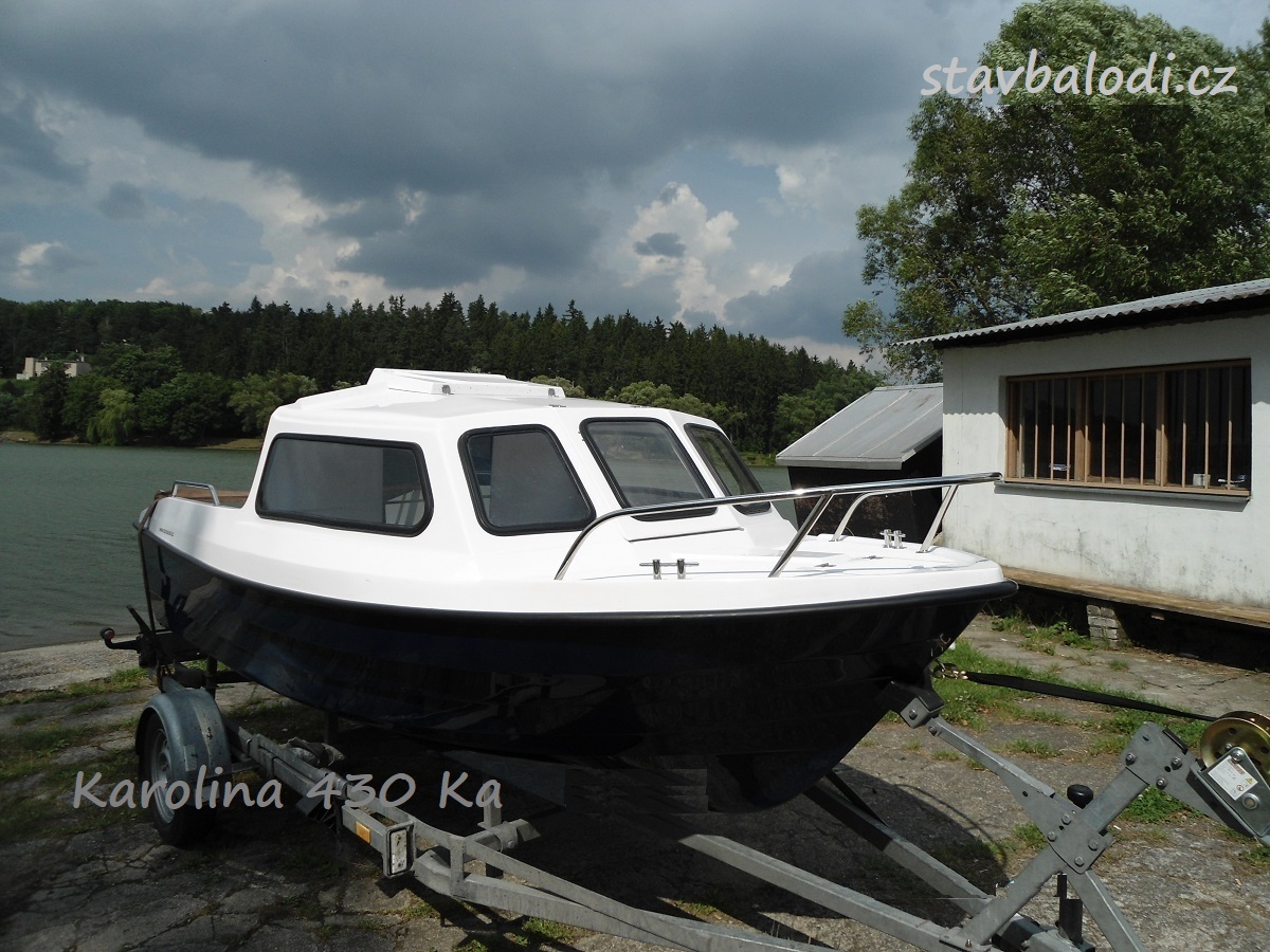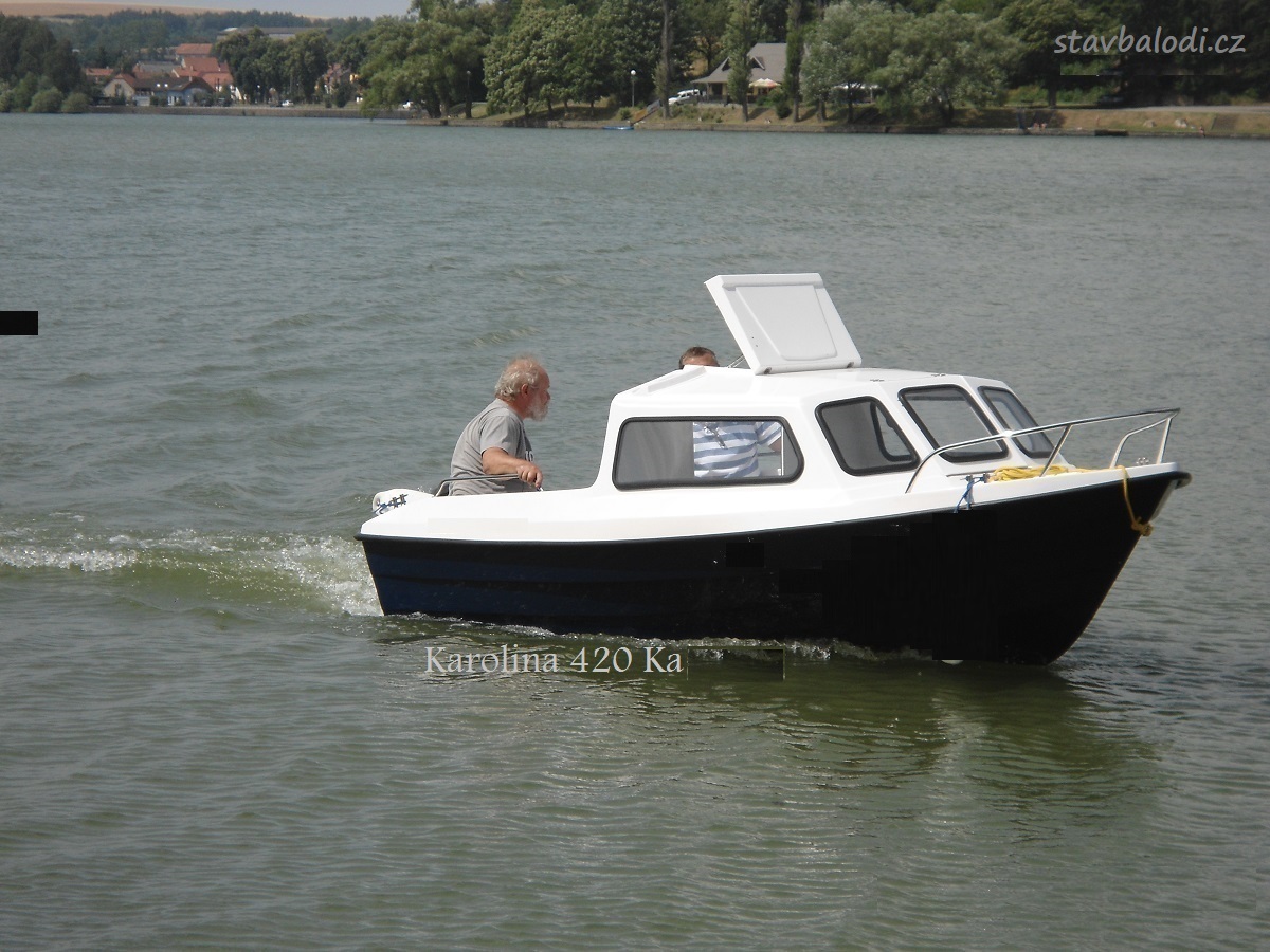 Motorový kajutový člun Karolina 430. Je nový, pohodlný člun pro rybaření a rekreaci na řekách, jezerech i mořském pobřeží. Pro průlez na příď slouží přední okno. Na přídi ve špici je schránka pro kotvu. Další schránky jsou v kajutě a v kokpitu pod sedačkami. Délka 420 cm, šířka 180 cm, váha 260 kg. Rozměry v kajutě 200cm x 155cm. Motor max. 30 Hp L dlouhá noha, posádka 4 osoby, kategorie plavby C příbřežní plavba.