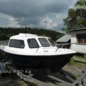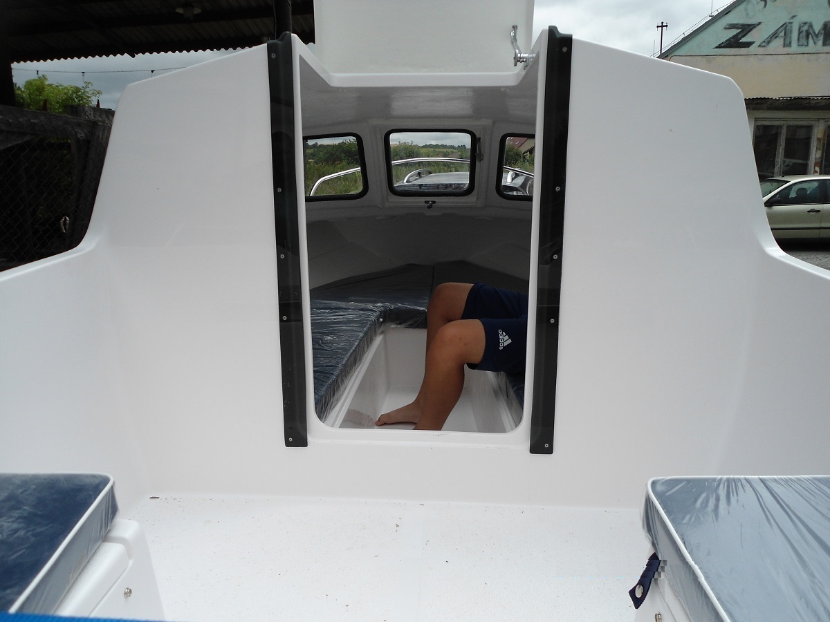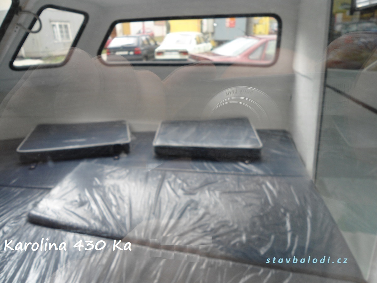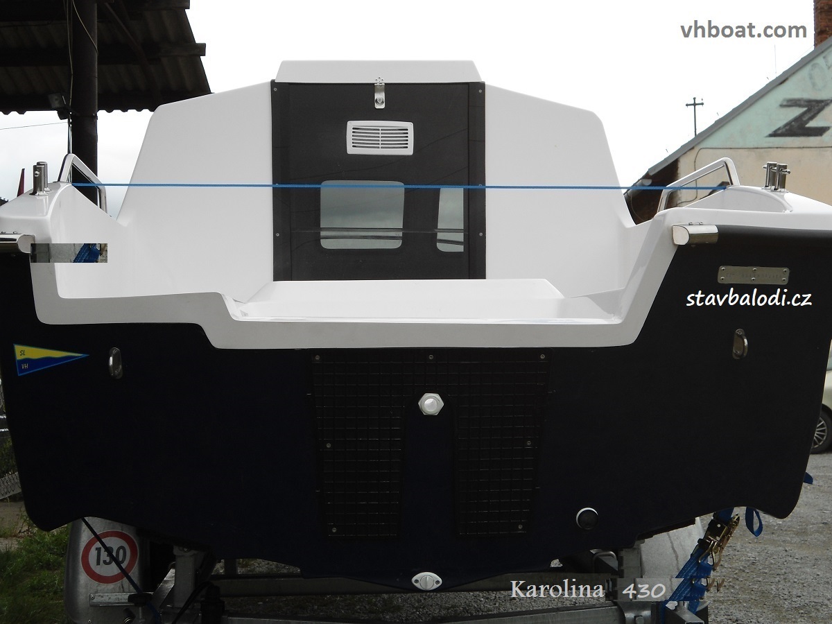 Motorový kajutový člun Karolina 430. Je nový, pohodlný člun pro rybaření a rekreaci na řekách, jezerech i mořském pobřeží. Pro průlez na příď slouží přední okno. Na přídi ve špici je schránka pro kotvu. Další schránky jsou v kajutě a v kokpitu pod sedačkami. Délka 420 cm, šířka 180 cm, váha 260 kg. Rozměry v kajutě 200cm x 155cm. Motor max. 30 Hp L dlouhá noha, posádka 4 osoby, kategorie plavby C příbřežní plavba.
