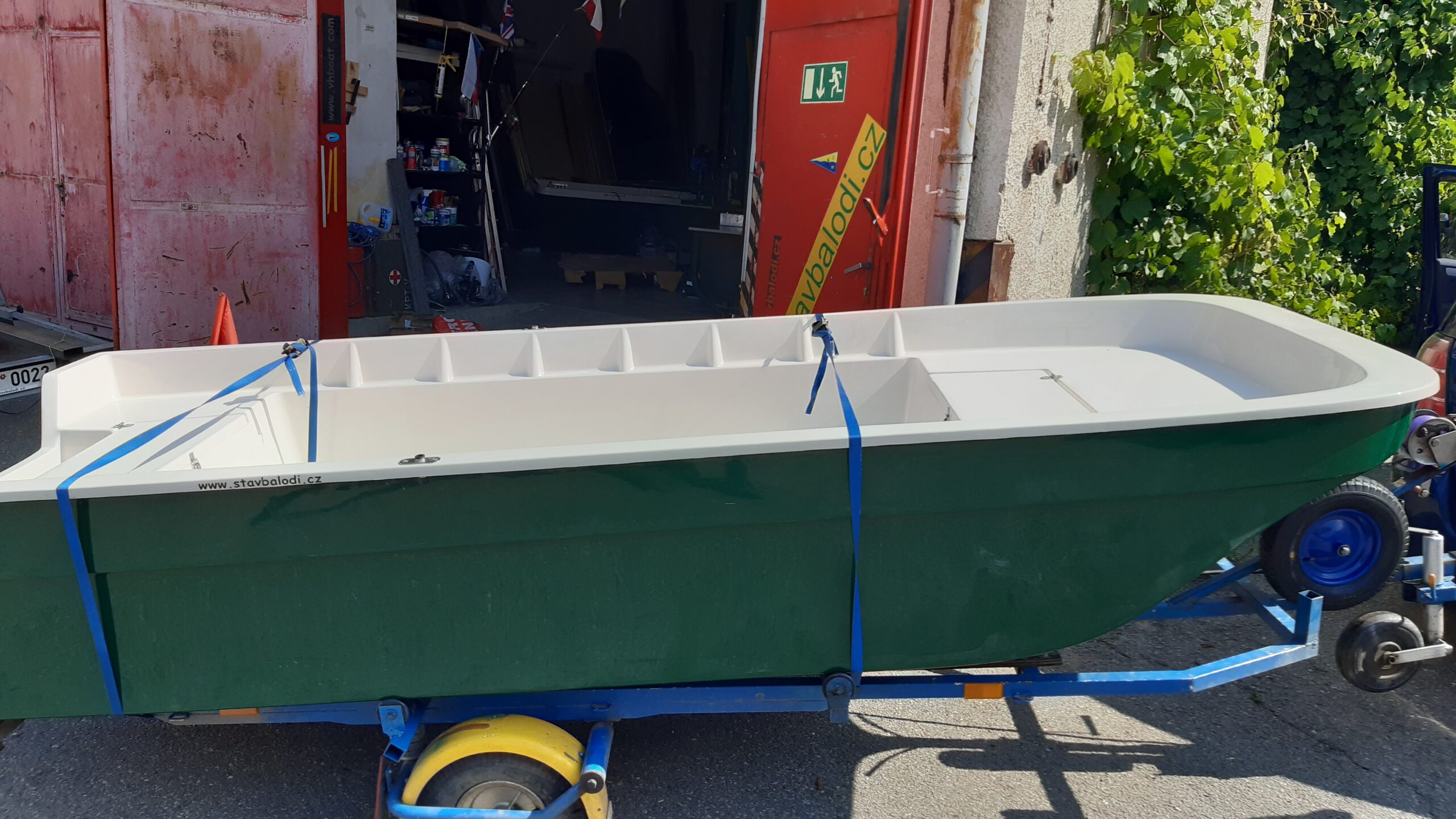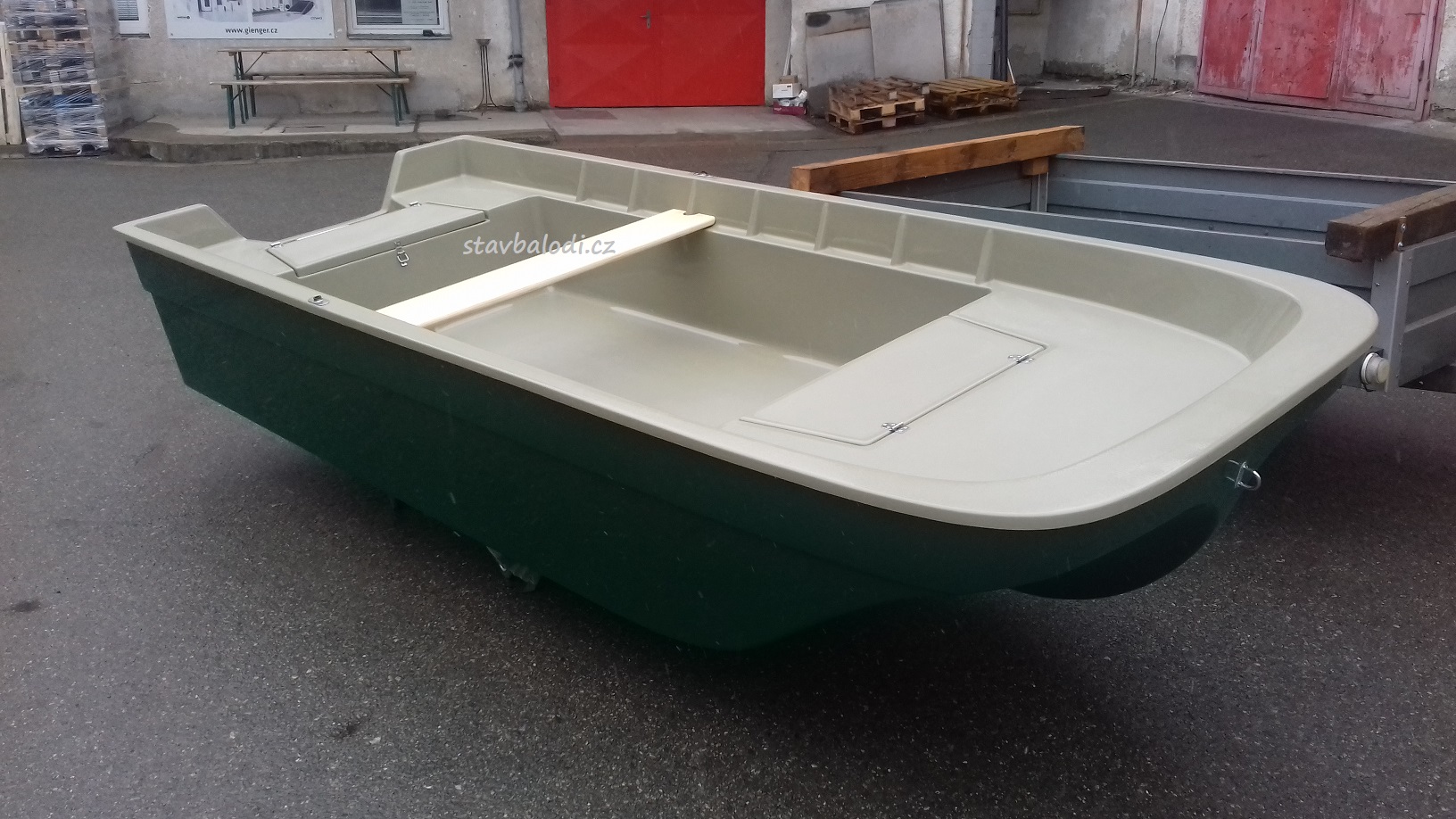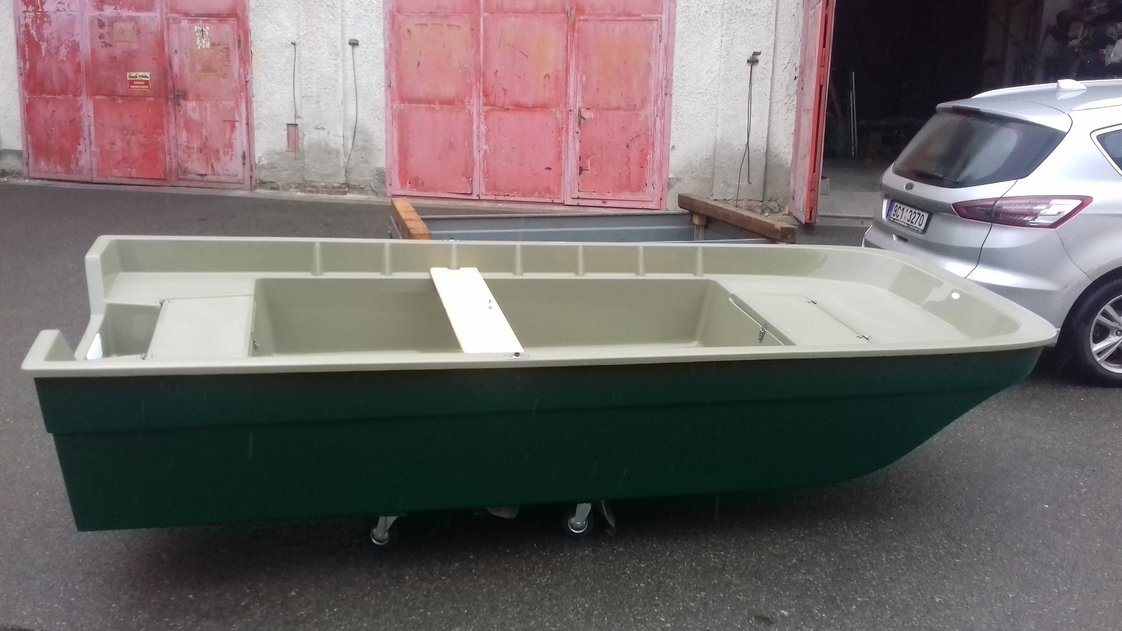 Prostorný člun se širokým trimaránovým trupem, který zajišťuje vysokou stabilitu. Člun je laminátový, nový, dvouplášťový, je vybaven dvěma uzamykatelnými schránkami pro uložení věcí, přestavitelnou lavičkou a je možné jej používat s různými typy pohonu závěsným motorem (spalovacím nebo elektromotorem) nebo vesly. Kování je z nere-zové oceli (úchyty pro vesla, panty, oko na přídi). Člun je stabilní a ideální pro lov sumců nebo rodinné výlety.