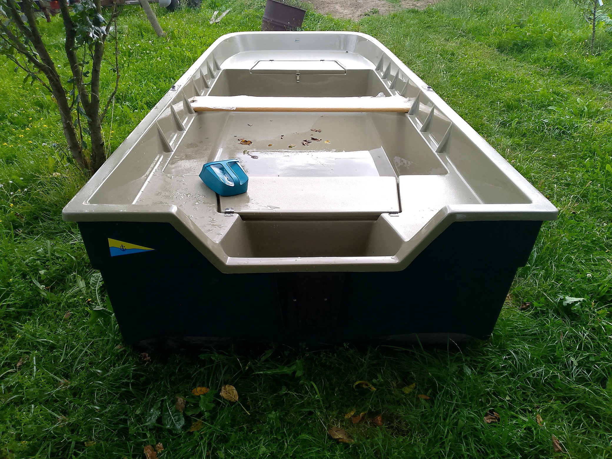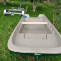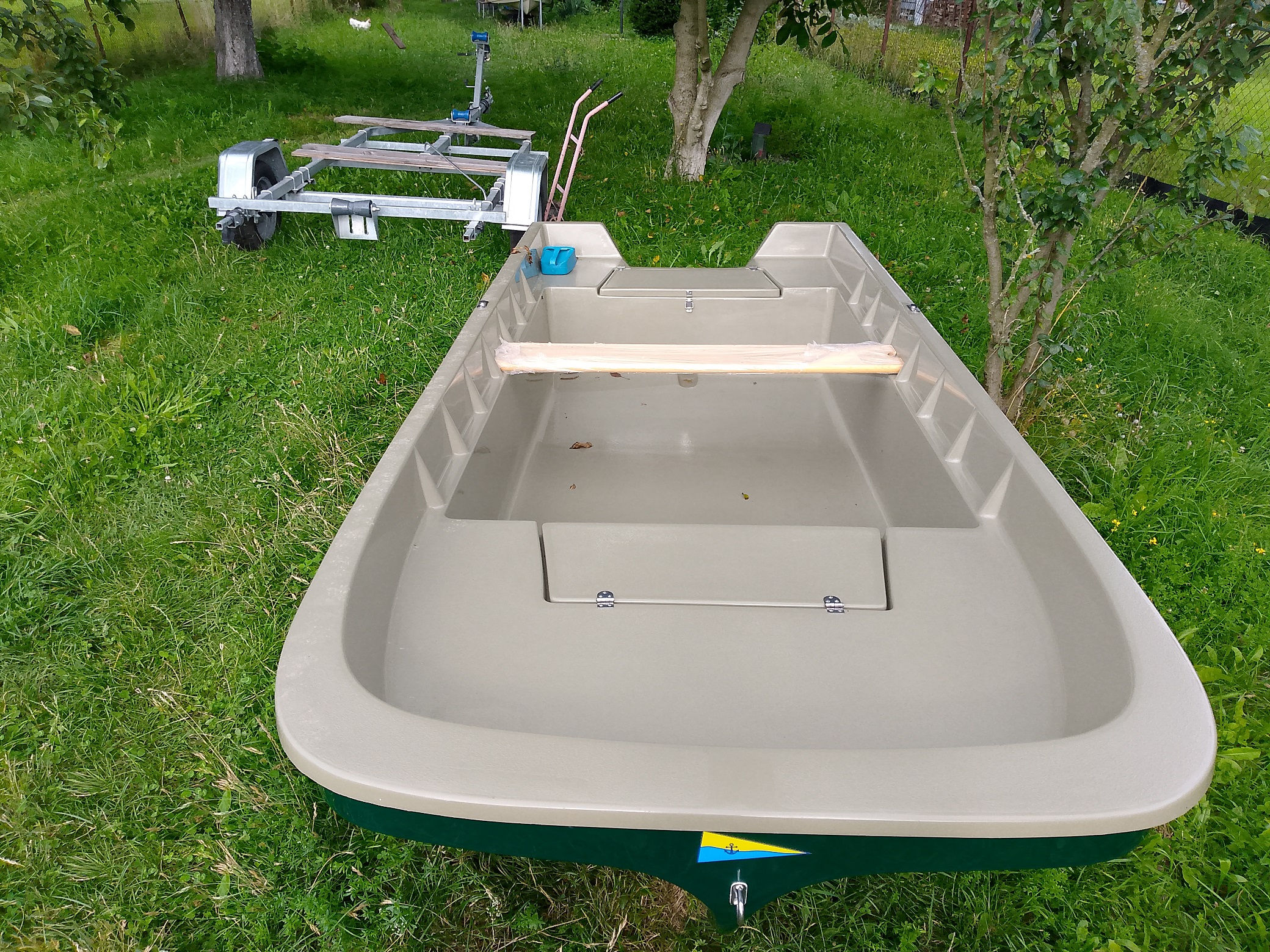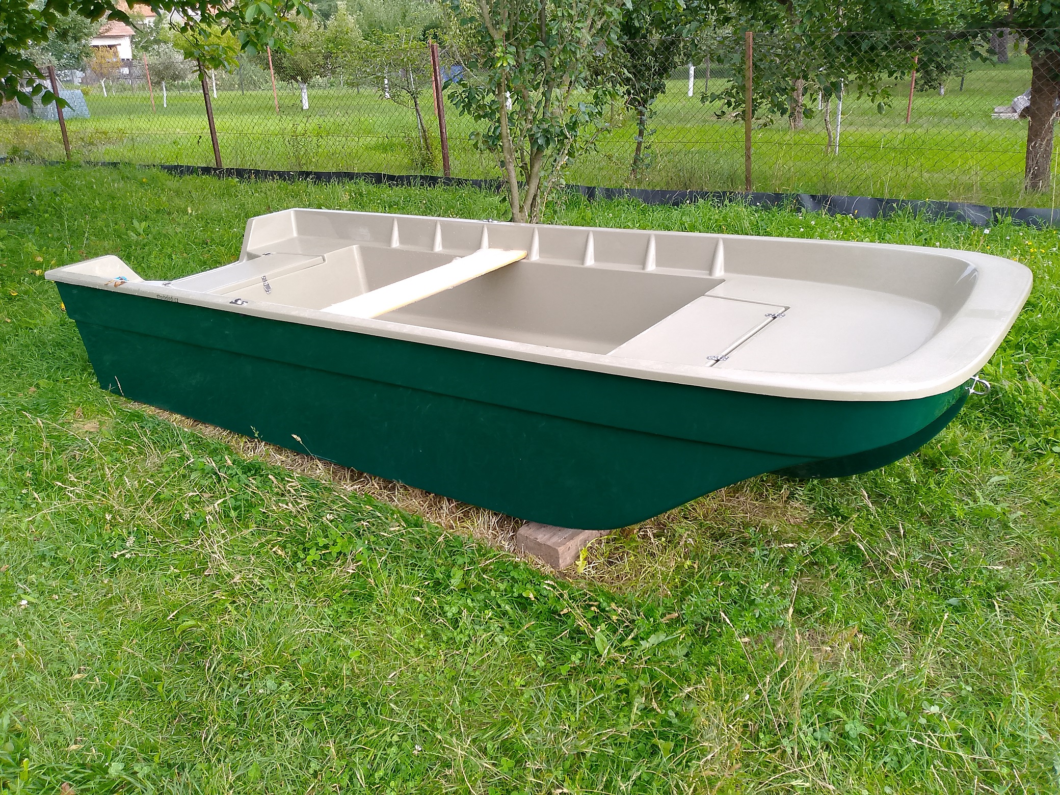 Prostorný člun se širokým trimaránovým trupem, který zajišťuje vysokou stabilitu. Člun je laminátový, nový, dvouplášťový, je vybaven dvěma uzamykatelnými schránkami pro uložení věcí, přestavitelnou lavičkou a je možné jej používat s různými typy pohonu – závěsným motorem (spalovacím nebo elektromotorem) nebo vesly. Kování je z nere-zové oceli (úchyty pro vesla, panty, oko na přídi). Člun je stabilní a ideální pro lov sumců nebo rodinné výlety.