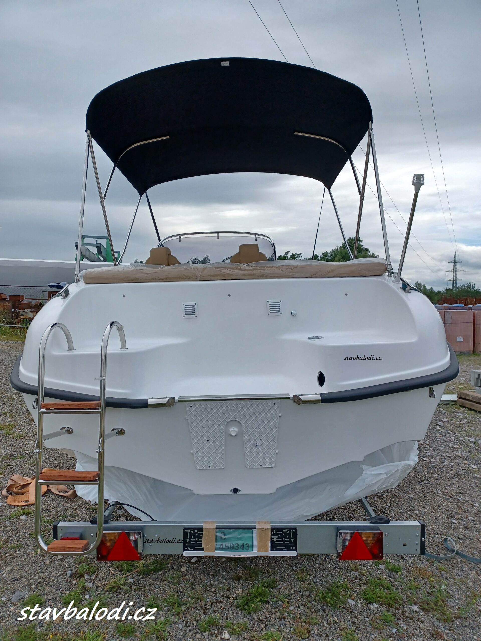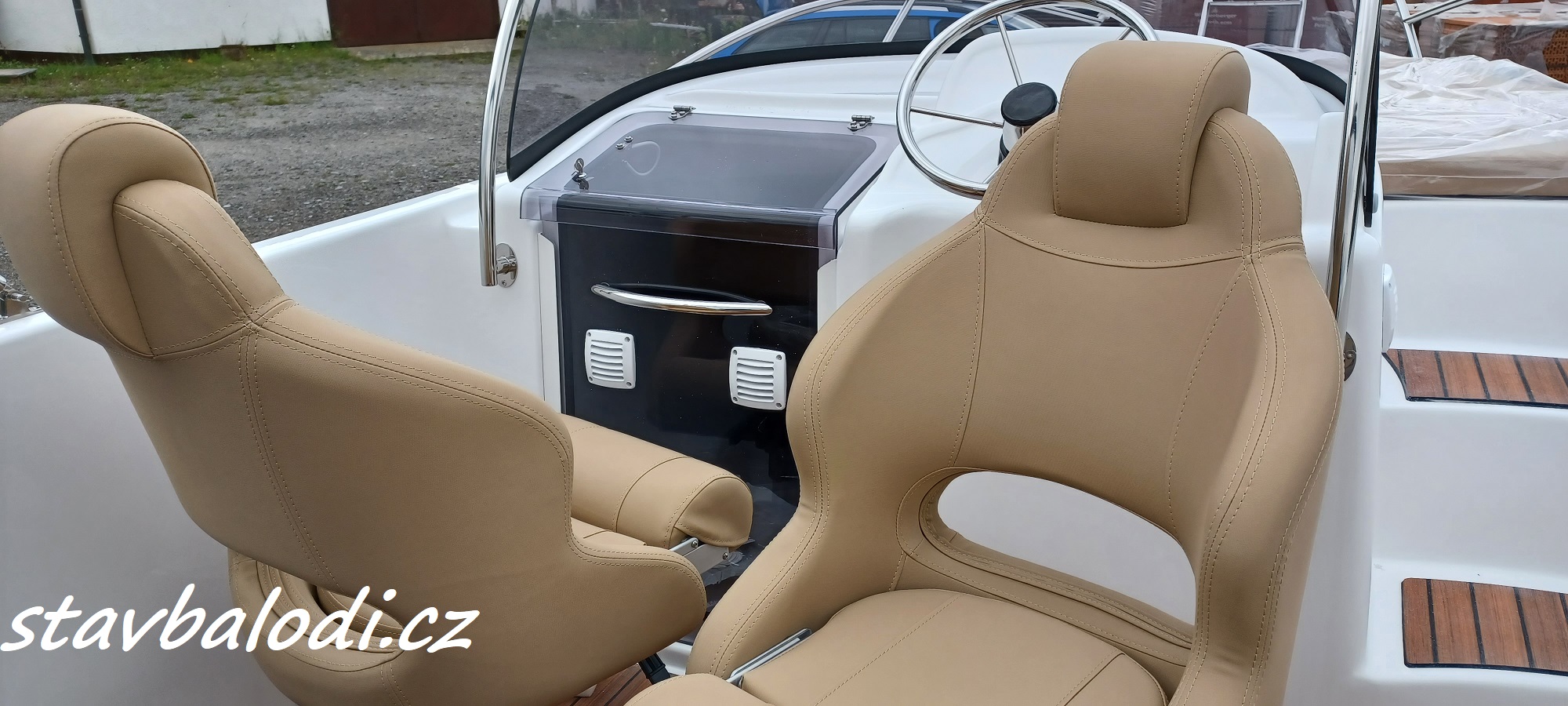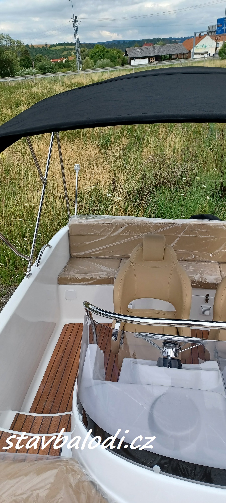 Relingy , polstrování vevnitř i venku, mechanické řízení-volant, převodovka, bovden, zamykací dvířka plexi, 4x vazáky, žebřík do vody, kapitánské křeslo, plexi štít chráněný nerez. rámem, odtok vody, odrazová guma kolem lodi.