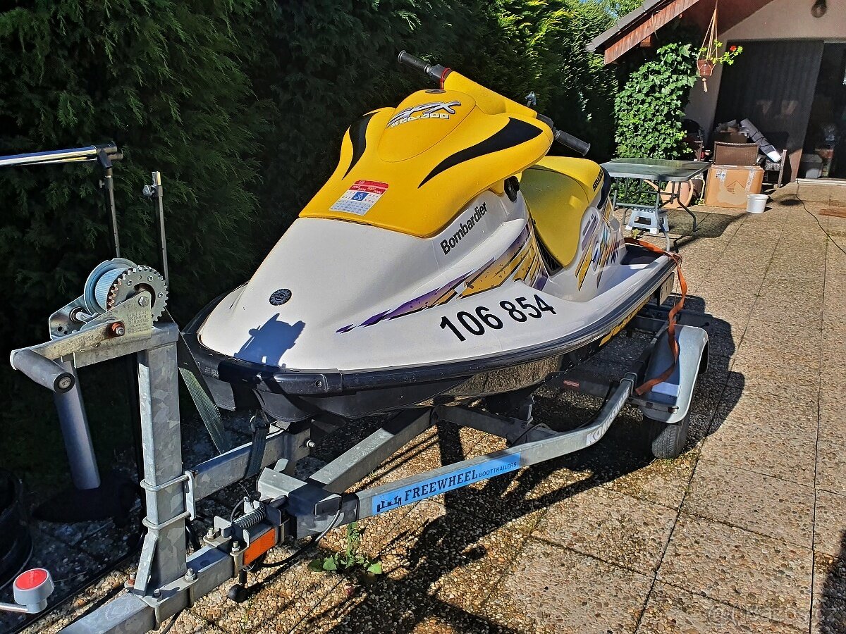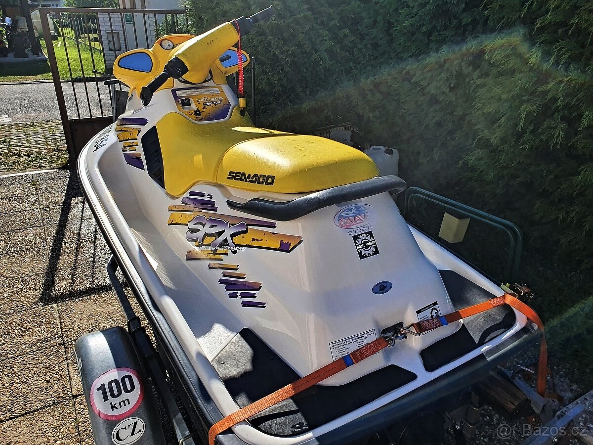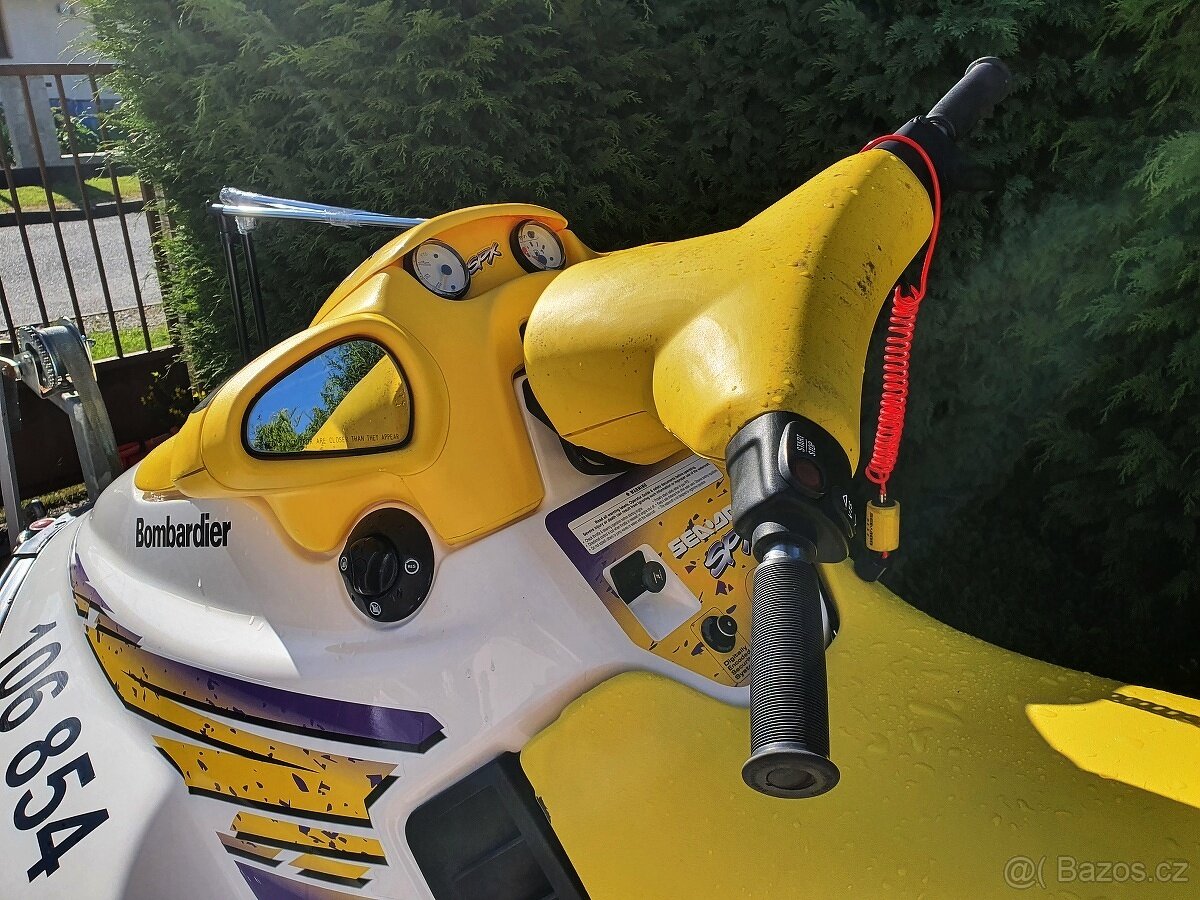 Žlutý vodní skútr laminát, délka 2,54 šířka 1,05, má trim, motor Bombardier Rotax, RV 1998, po servisu. Překvapivě malá spotřeba, kolem 7-10 l/hod.