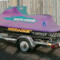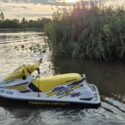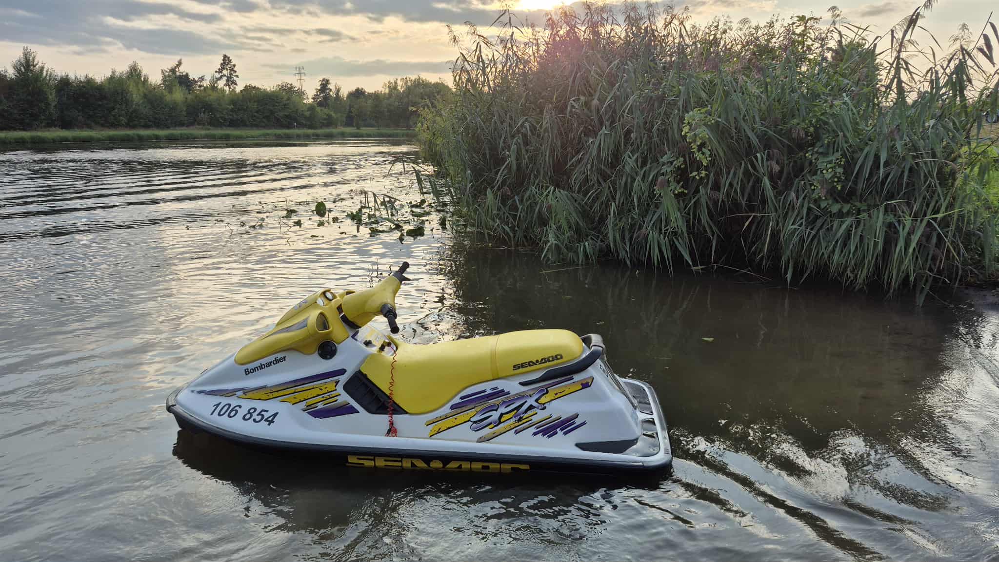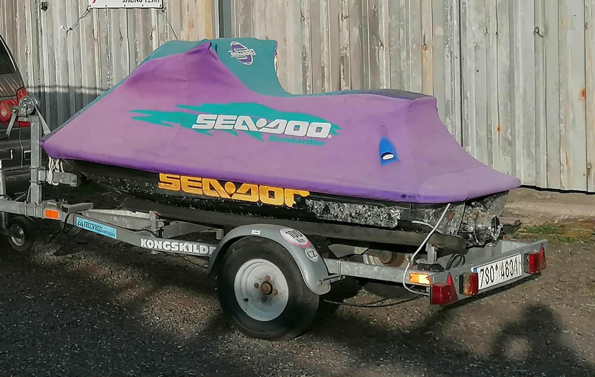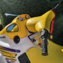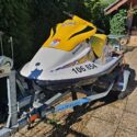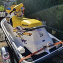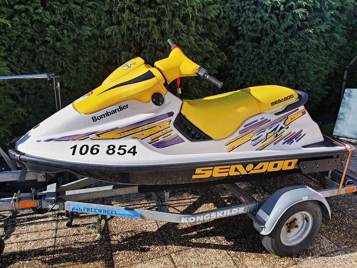 Žlutý vodní skútr laminát, délka 2,54 šířka 1,05, má trim, motor Bombardier Rotax, RV 1998, po servisu. Překvapivě malá spotřeba, kolem 7-10 l/hod.
