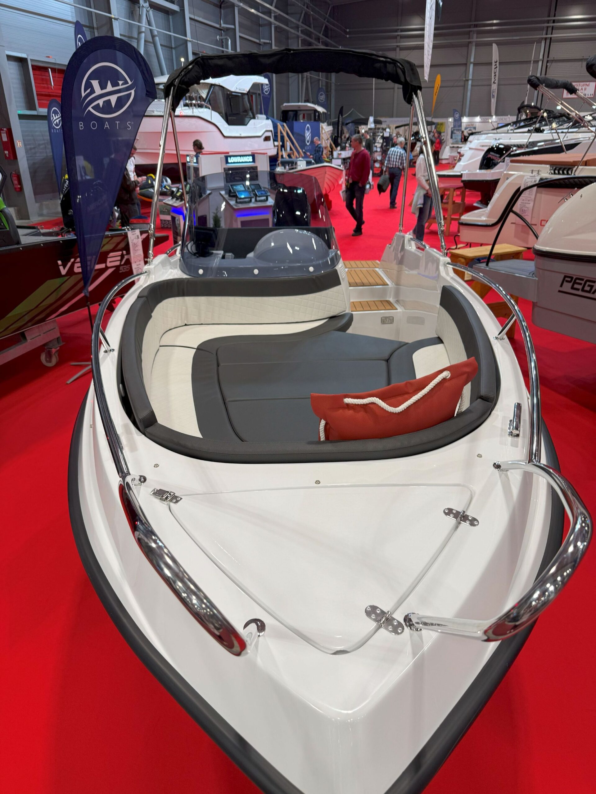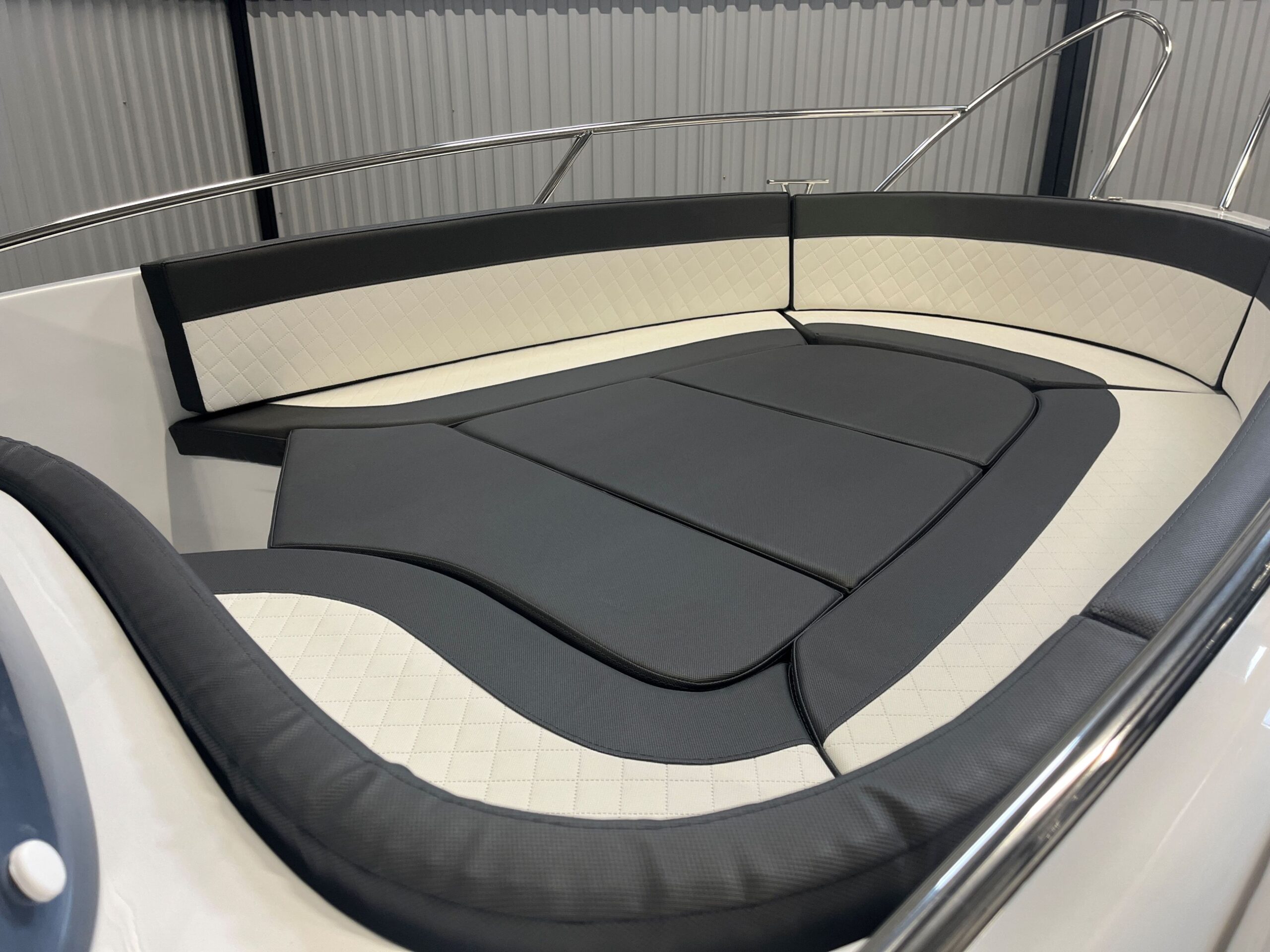 Loď je vybavena dvoubarevnými matracemi, piké - Vinylpex white/ carbon, krycí plachtou - černá, bimini - černé, koupací platformy na zádi lodi, schůdky do vody