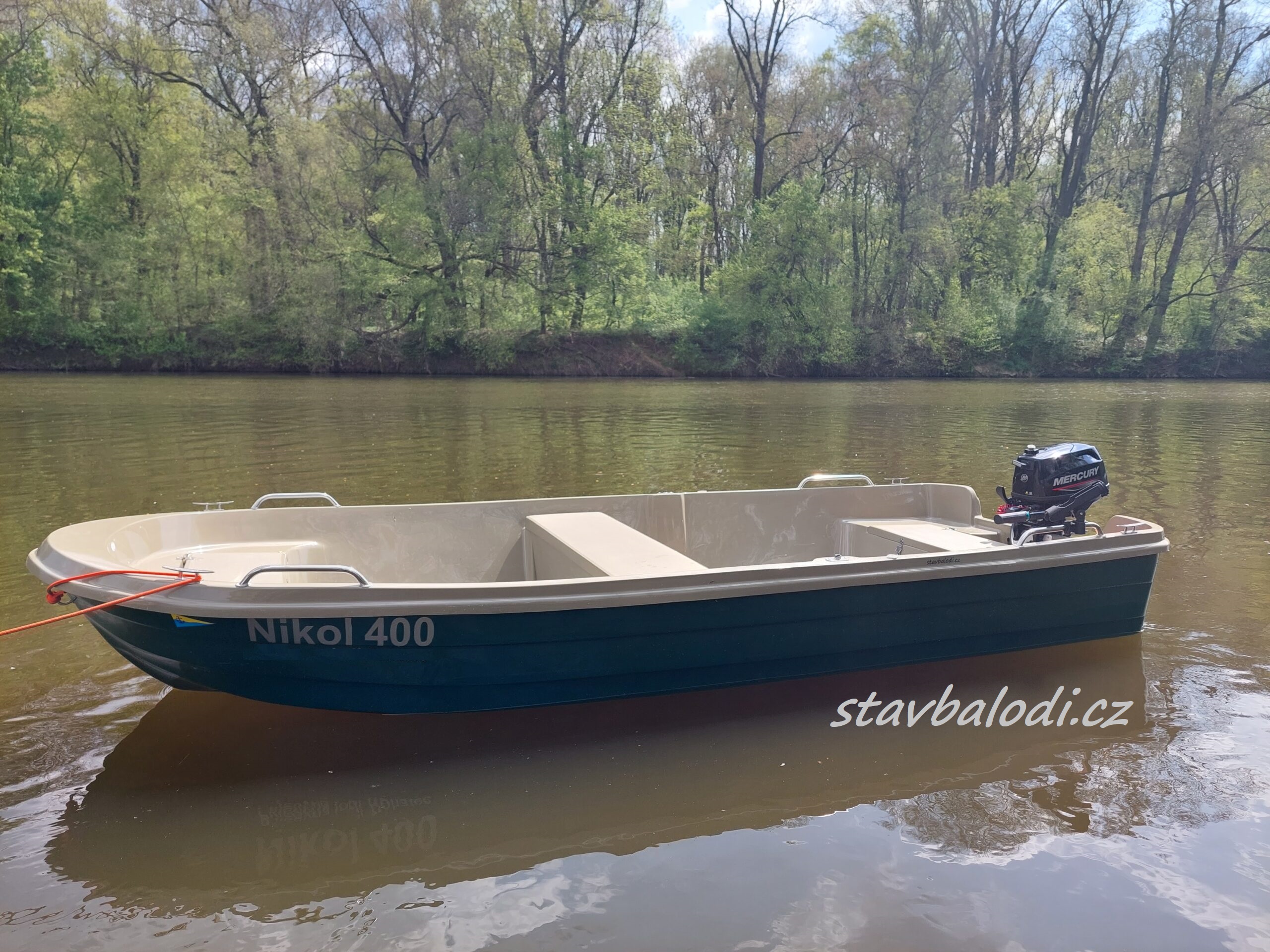 Rybářský člun, veslice, pramice, loď Nikol 400 nový laminátový, dvouplášťový člun je široký, stabilní s přídí do špice a širokým dnem. . Ideální volba pro rybáře, kteří hledají spolehlivý, prostorný a multifunkční člun pro své výpravy. Člun je ověřený a oblíbený mezi sumcaři. V kokpitu má člun pod sezením na přídi a na zádi schránky pro uložení věcí v suchu. Střední lavičku dělá odnimatelný kontejner, který se dá rovněž použít pro uložení věcí, anebo může rybářům posloužit pro nástražné, anebo ulovené ryby ve vodě. Při jeho vyndání vznikne v jeho kokpitu velký prostor, který využívají rybáři také k přespání. Člun lze pohánět pomocí vesel, anebo motorem do 8 Hp S, krátká noha.