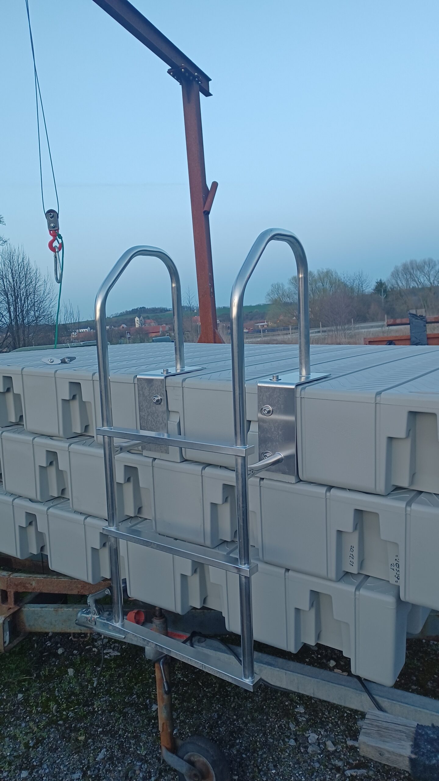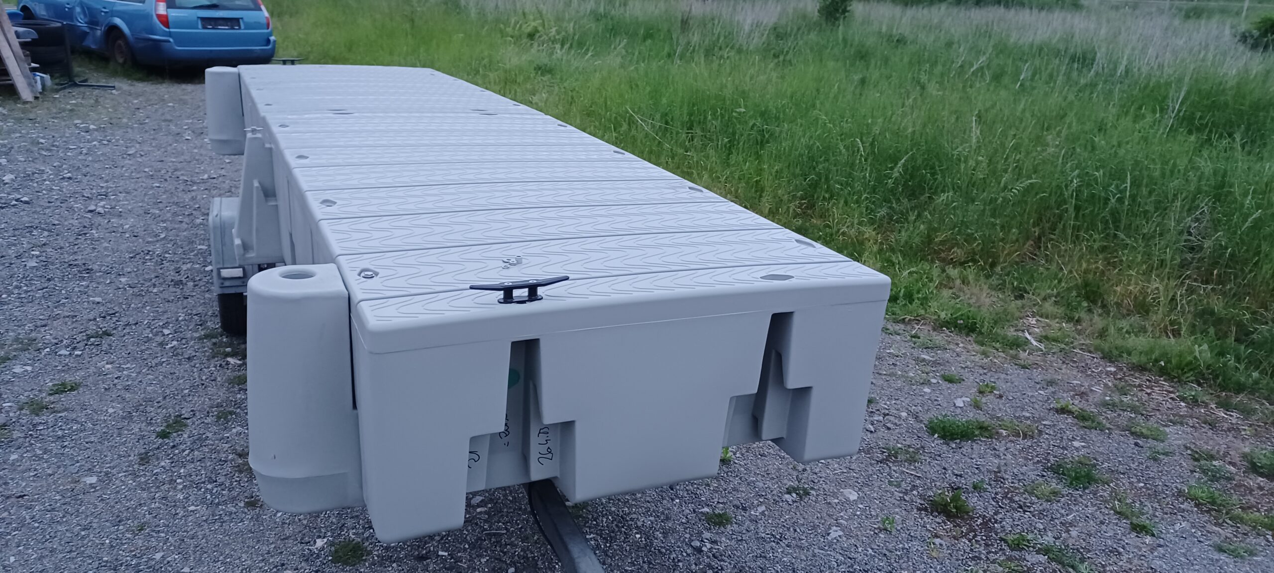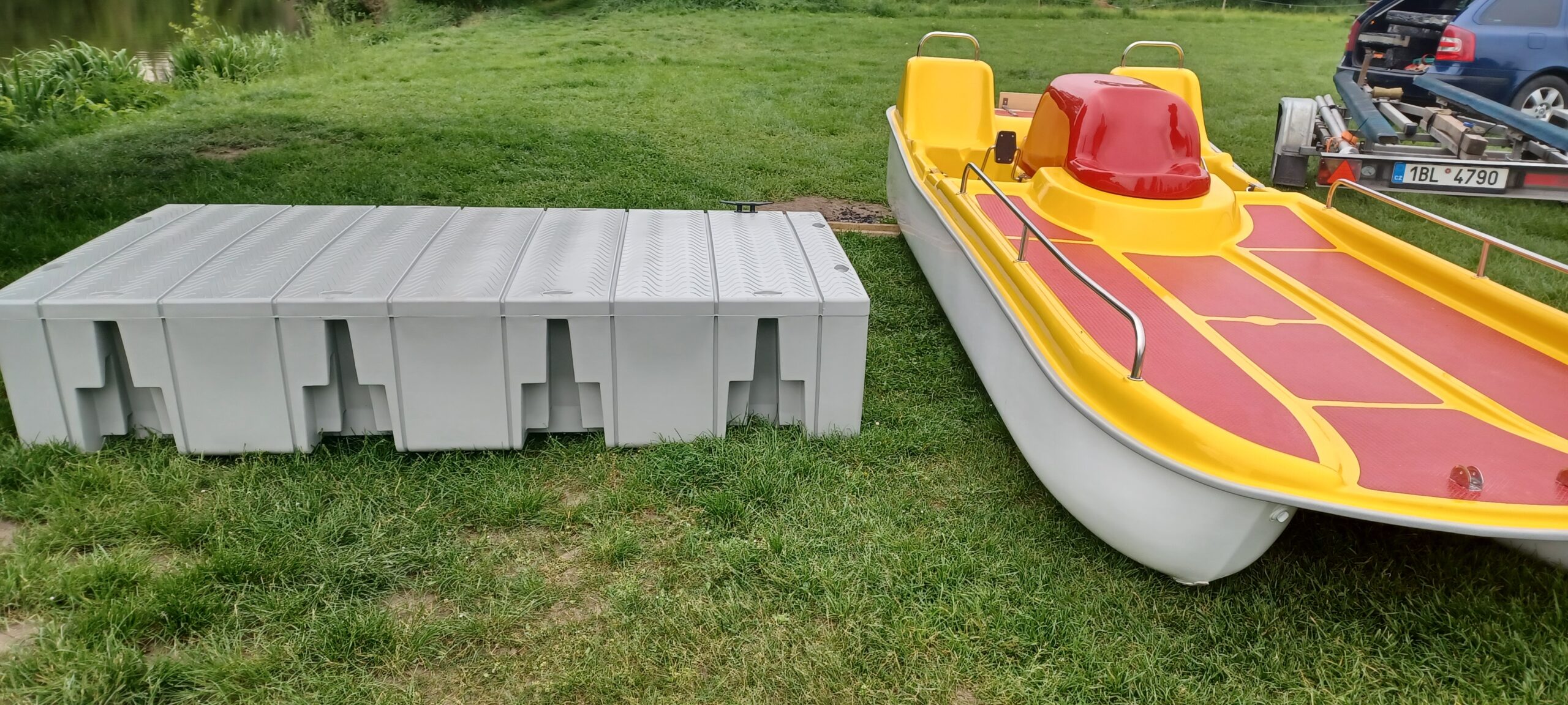 Plováky pro stavbu plovoucího přístavního mola M 50 Plováky jsou nové, vyrobeny z odolného plastu – polyetylenu, který je odolný nárazu, mrazu, UV záření je bezúdržbový nejsou potřebné pravidelné nátěry. Pochozí povrch je protiskluzový. Sestavení mola je snadné a rychlé v různých tvarech a velikostí. Roste dle potřeby rozšíření anebo zátěže. Délka 246cm, šířka 123 cm, výška 50 cm, plocha 3 m2, váha plováku 90,1 kg, zatížení 1 139 kg, 380 kg na m2 cena plováku 18 900,-Kč 6 300,- za m2