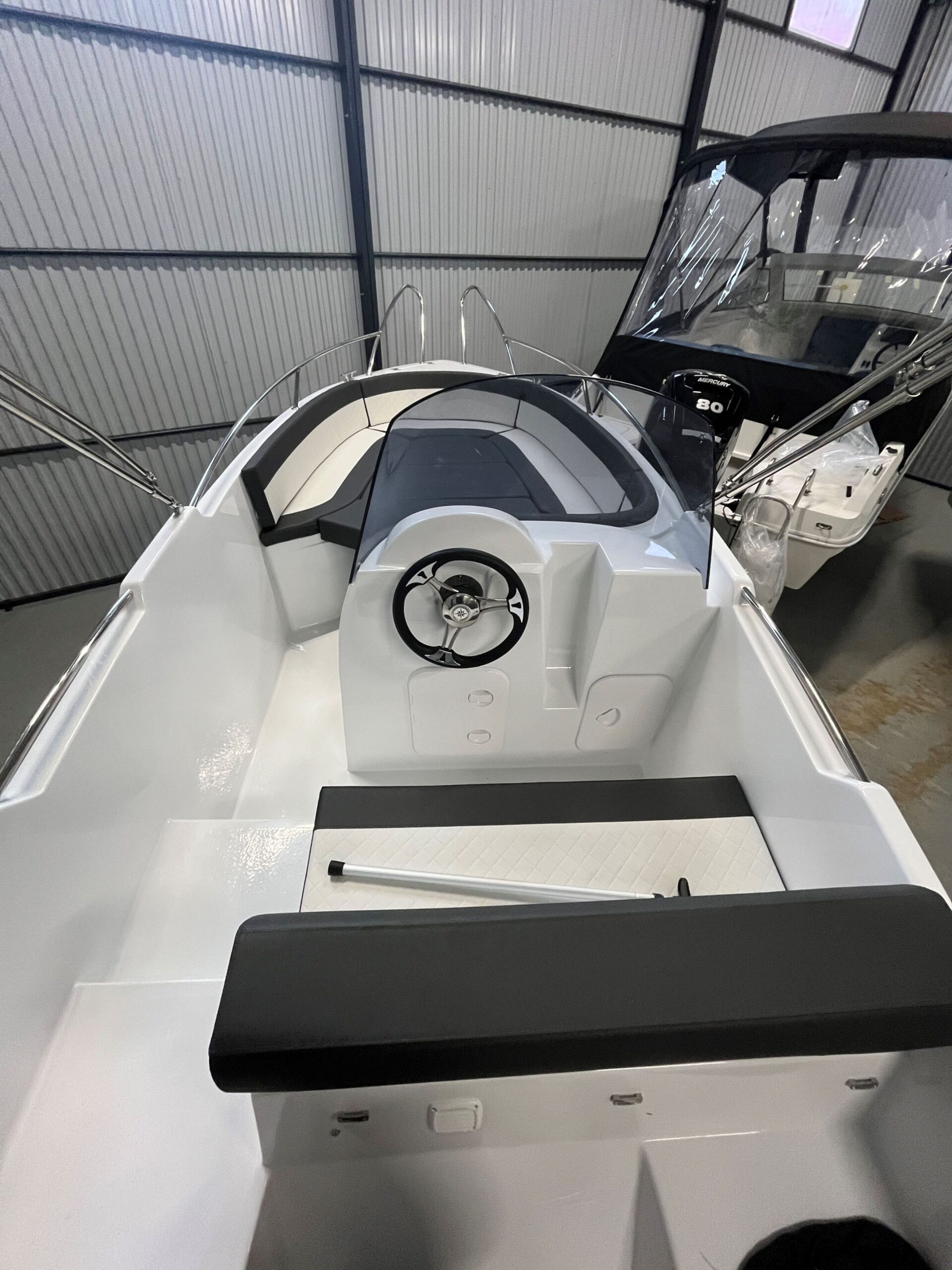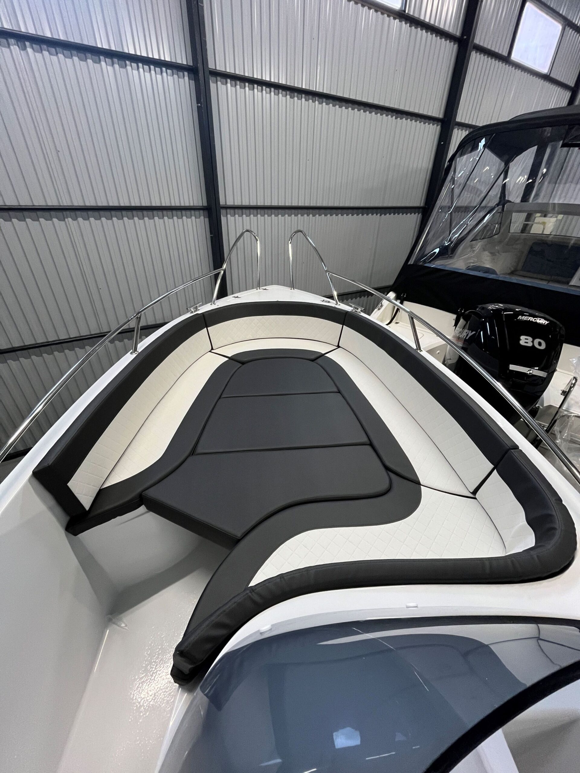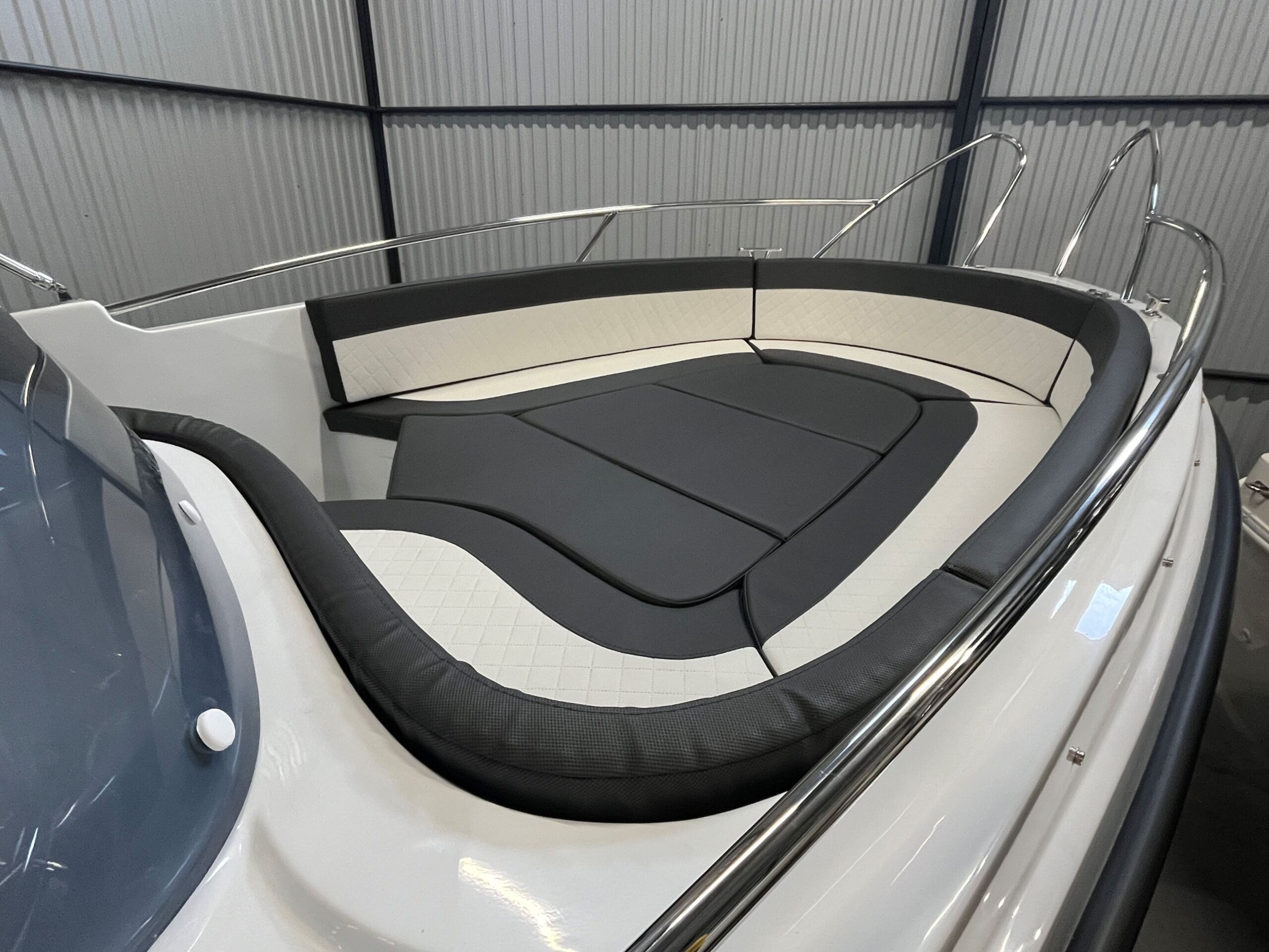 Loď je vybavena dvoubarevnými matracemi, piké - Vinylpex white/ carbon, krycí plachtou - černá, bimini - černé, koupací platformy na zádi lodi, schůdky do vody