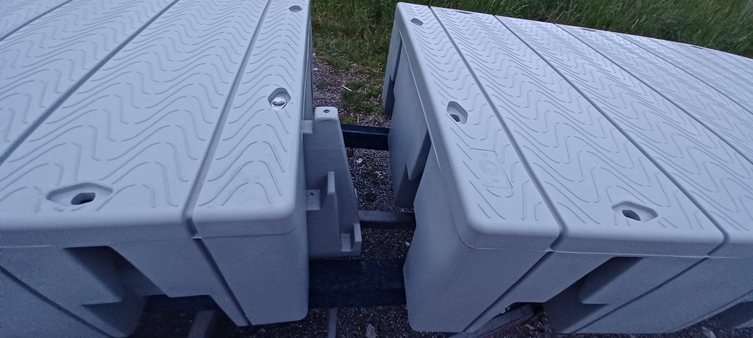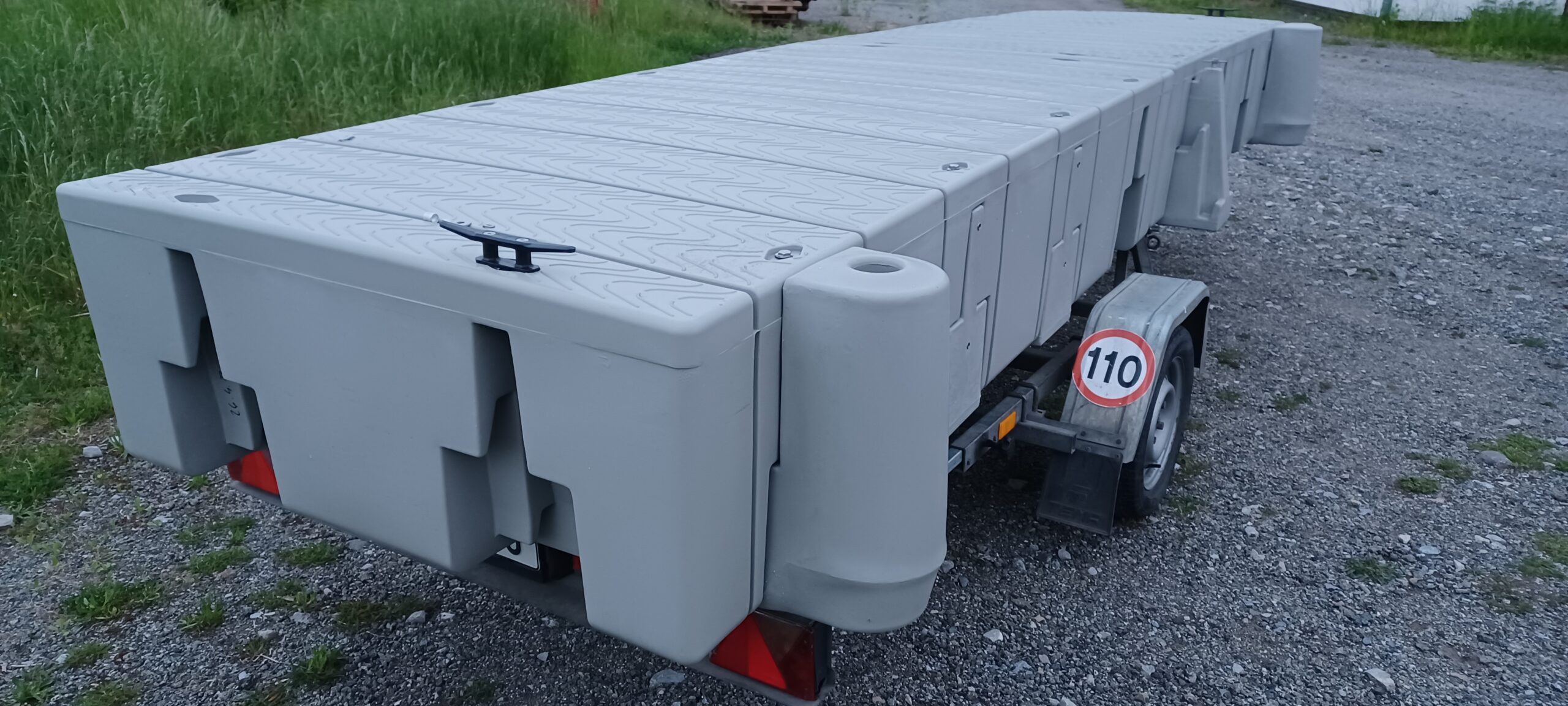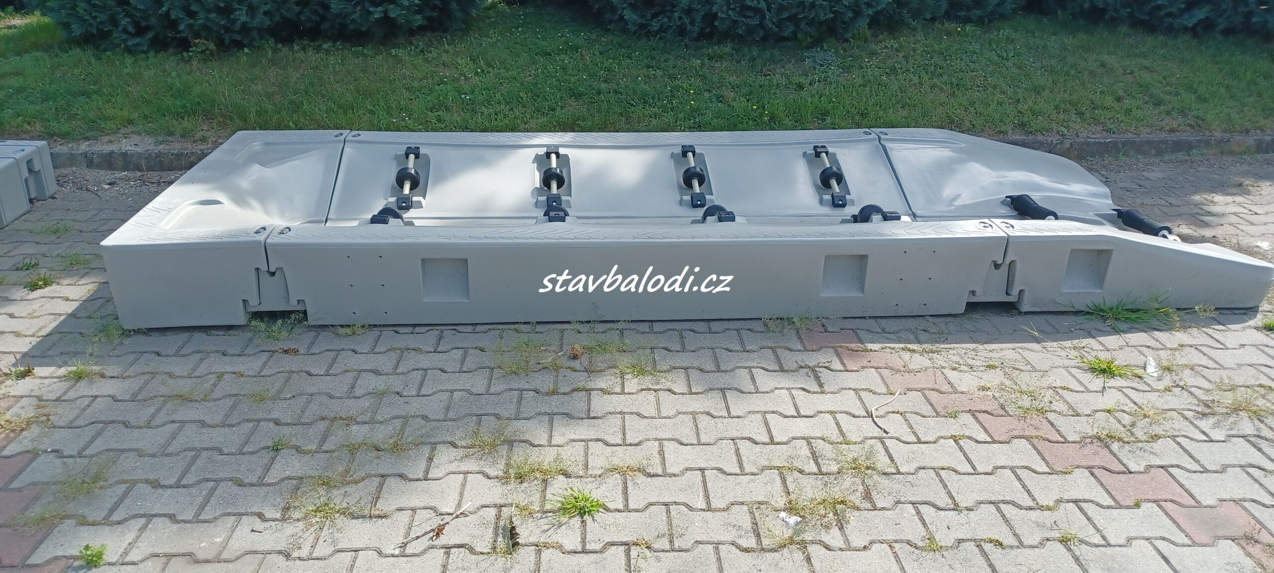 Plováky pro stavbu plovoucího přístavního mola M 50 Plováky jsou nové, vyrobeny z odolného plastu – polyetylenu, který je odolný nárazu, mrazu, UV záření je bezúdržbový nejsou potřebné pravidelné nátěry. Pochozí povrch je protiskluzový. Sestavení mola je snadné a rychlé v různých tvarech a velikostí. Roste dle potřeby rozšíření anebo zátěže. Délka 246cm, šířka 123 cm, výška 50 cm, plocha 3 m2, váha plováku 90,1 kg, zatížení 1 139 kg, 380 kg na m2 cena plováku 18 900,-Kč 6 300,- za m2