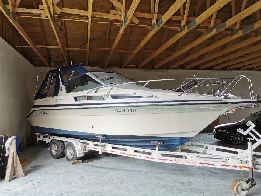 Prodám bezvadnou a velmi prostornou motorovou jachtu DRACO 2700, délka 9m, se zabudovaným motorem ve vynikající kondici VOLVO PENTA AQ271/290 DP.Motor má originál Volvo výměník se stálou náplní antifreez.Lod plula pouze na SLADKE vodě,proto je absolutně bez jakékoliv koroze jak motoru,vlastní Z-nohy /duoprop vrtule/ elektroinstalace a pod.Je samozřejmně vybavená i pro dlouhodobý pobyt:Nádrž benzínová 400L,na vodu 120L,fekální 120L-macerátor.Má dále 2 kajuty-spaní pro 5 osob,vybavená kuchyn,sprcha s WC pod uzavřením,silný elektrický kotevní navyják s nerez.kotvou,el.instalace 220V,komplet kočárová střecha.Plně plavby schopná bez jakýchkoliv investic.Nyní předvánoční cena pouze 499000,- /běžná cena v EU cca 30-37000eur a to ještě za lod v podstatně horší kvalitě!/